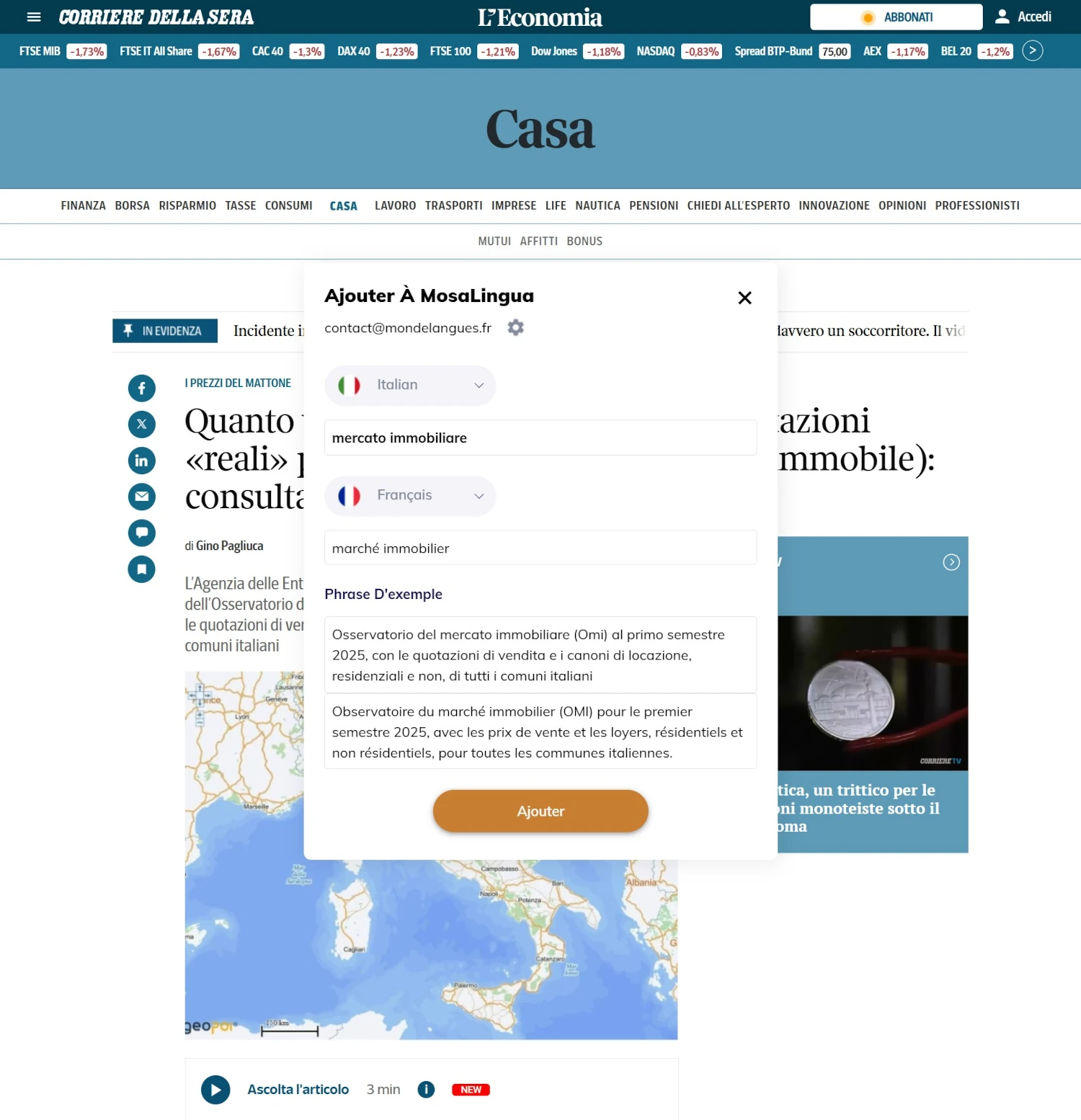 Un exemple d’ajout de carte, sur le site d’un journal italien. Vous pouvez prendre n’importe quel mot (ici, mercato immobiliare) et l’ajouter à vos cartes mémoire, avec la phrase entière pour fournir le contexte.