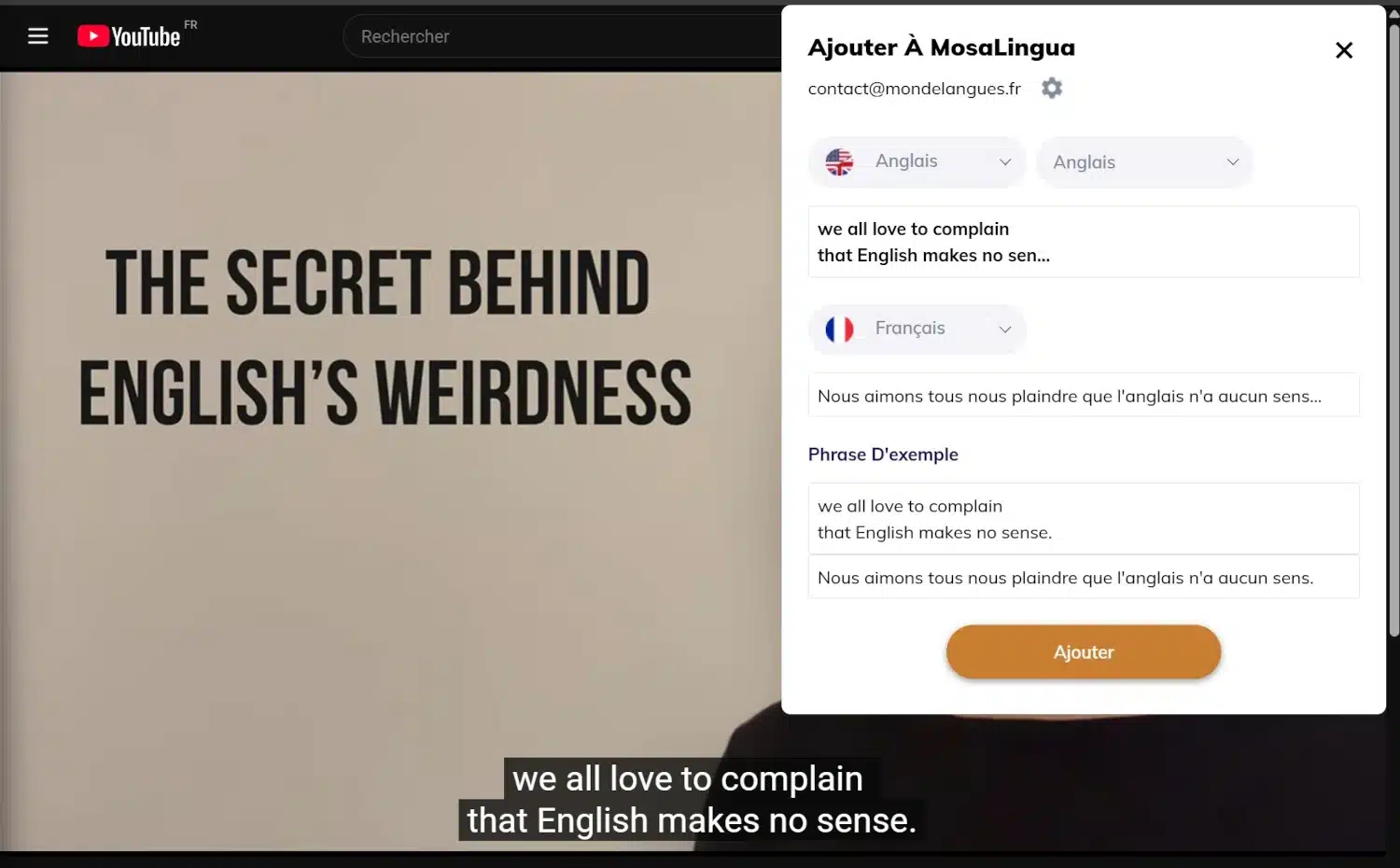 Outre les textes, MosaDiscovery vous permet d’ajouter le vocabulaire d’une vidéo (YouTube ou Netflix). Une immersion complète dans votre langue cible.