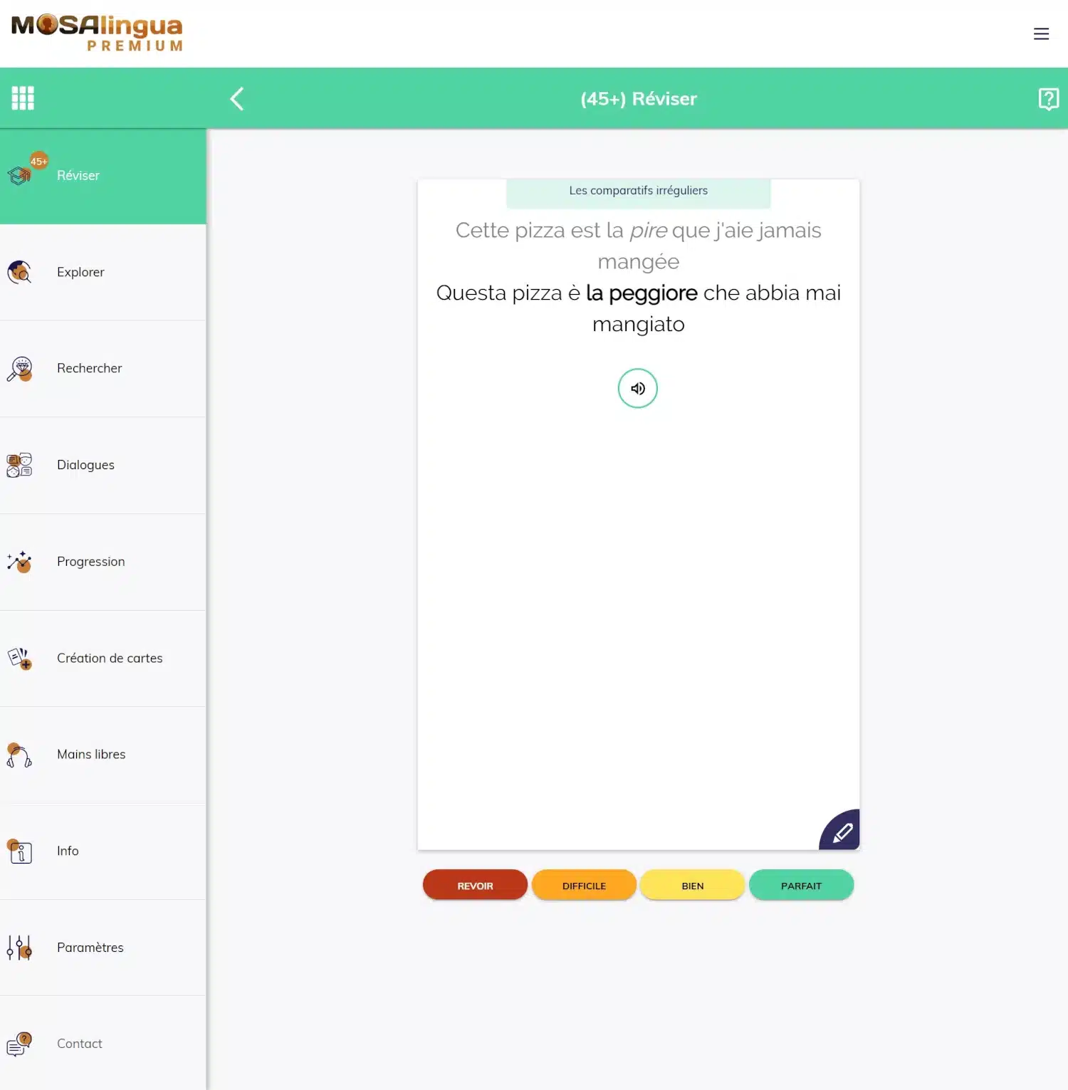 Révision d’une carte mémoire, avec une expression. Les réponses (de « revoir » à « parfait ») vous permettet de contrôler finement vos futures révisions : plus une carte vous pose problème, plus elle reviendra souvent.