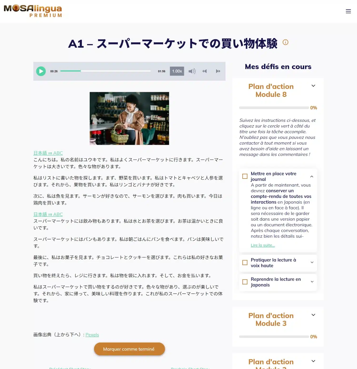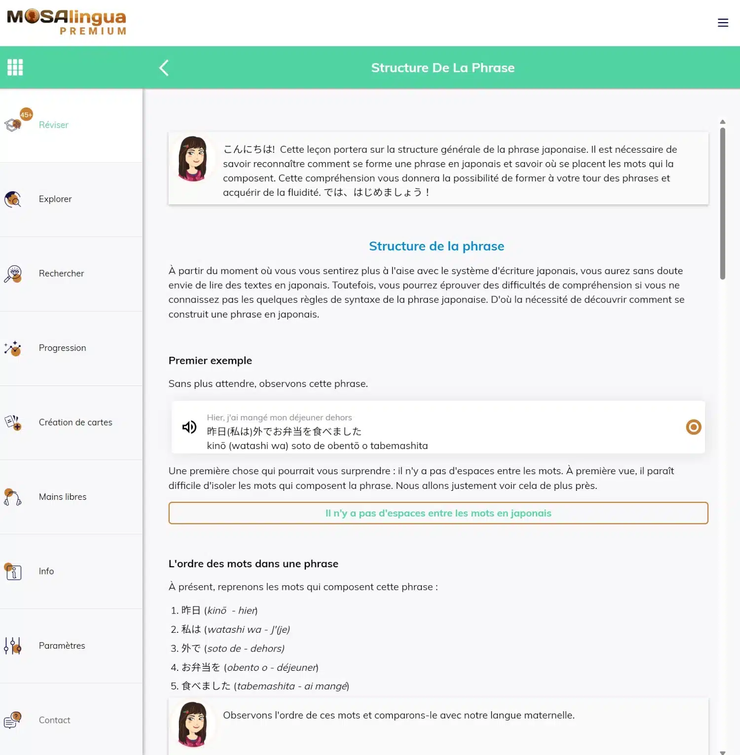 - Des leçons et des packs optionnels : des explications très complètes sur différents points de la langue (écriture, prononciation, grammaire), des dialogues, des listes d’argot, de faux-amis…