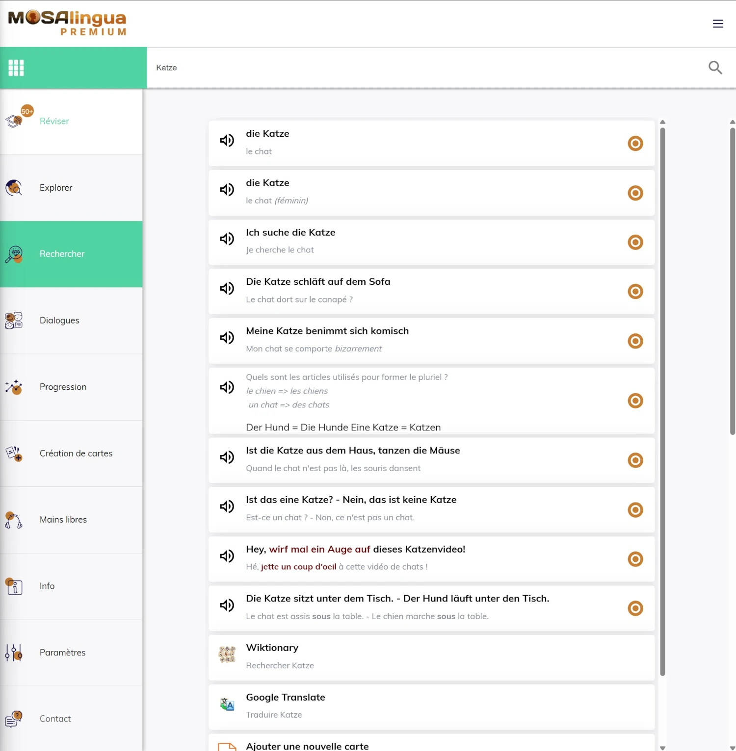 Si vous tombez sur un mot que vous souhaitez apprendre, vous pouvez le rechercher dans l’appli et l’ajouter à vos révisions. Vous pouvez même exclure des cartes, en cliquant sur l’icône en forme de cercle. C’est vous qui décidez !